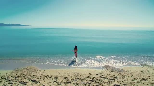 AERIAL WS Woman with surfboard running into sea / Cagliari, Sardinia, Italy