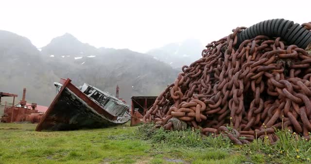 1118486 - Ship wreck and heap of rusty chains at abandoned