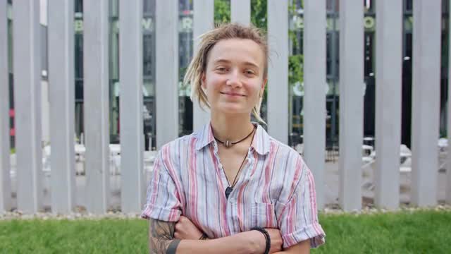 1024562 - Young Lady with Modern Hairstyle Smiling Outdoors