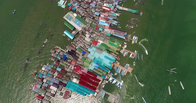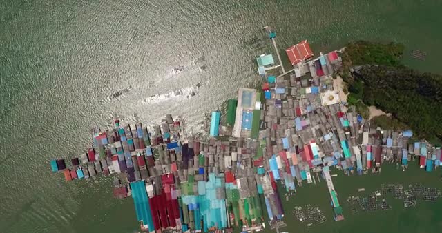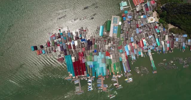 Aerial view Ko Panyi or Koh Panyee is a Muslim fishing village in Phang Nga Province Thailand notable for being built on stilts by Indonesian fishermen, Andaman Sea, Asia, RED EPIC
