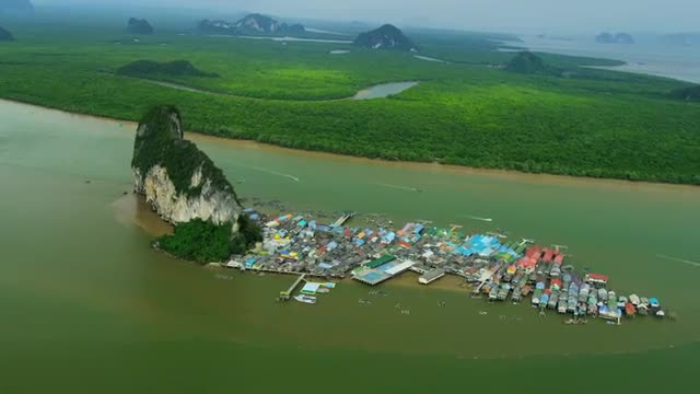 Aerial view Ko Panyi built on stilts a tourist Muslim village seafood restaurants souvenir stalls, school and floating football pitch, Thailand RED EPIC