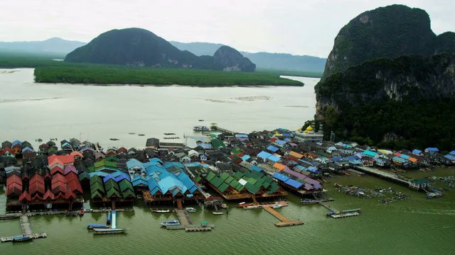 > Aerial view Koh Panyee Muslim village restaurants and stalls, Thailand