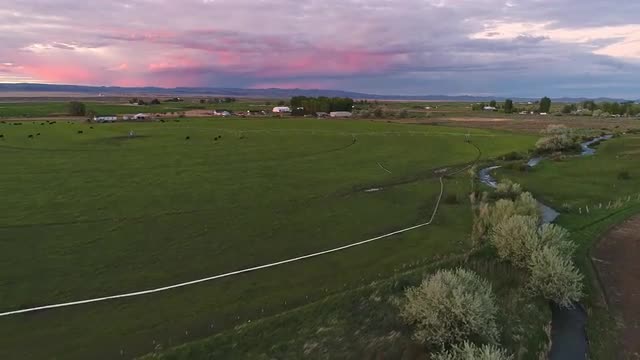 Panning view of sunset over farm field as sun shines through row of trees.