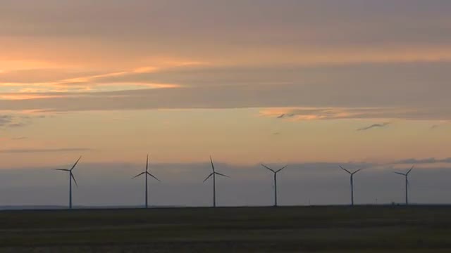 Wind mills slowly turning on rolling hills in Idaho