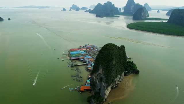 Aerial view tourist boats leaving Ko Panyee stilted Muslim village, Ao Phang nga National Park, Phang nga Bay, Southern Thailand, Asia, RED EPIC