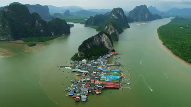 > Aerial view Ko Panyi a Muslim fishing village, Phang nga bay, Thailand
