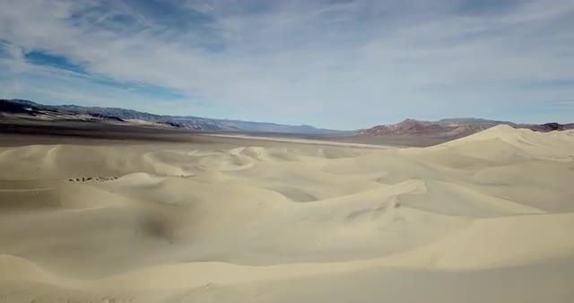 > Wide aerial shot of sand dunes near Pacific Ocean