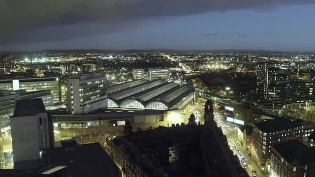 Manchester Picadilly at night. Drone aerial view.