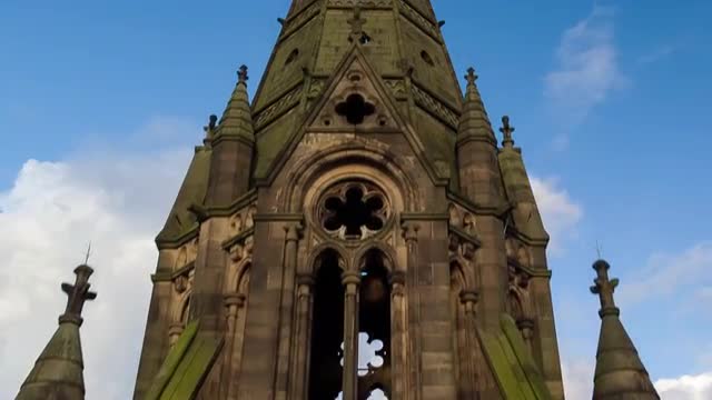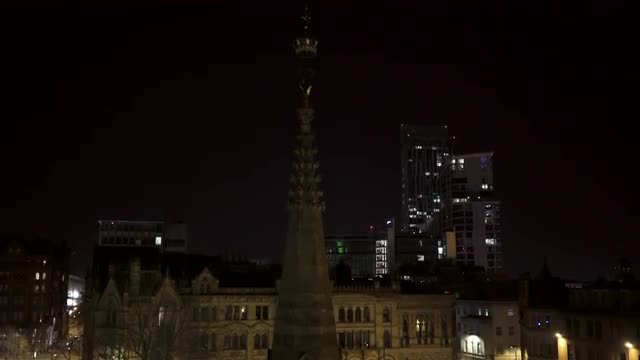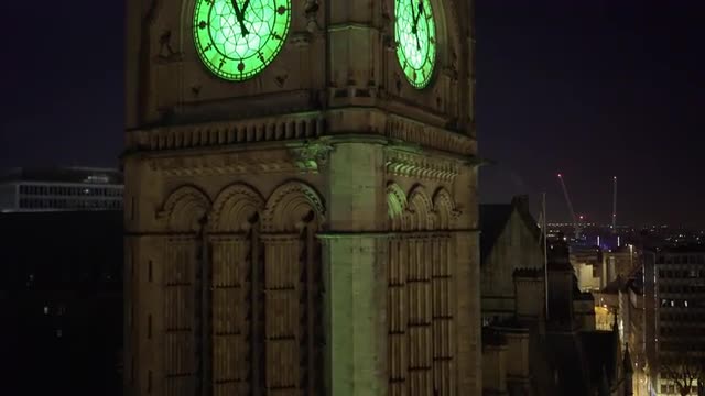 Drone footage of Manchester Town Hall. Close up. Day time.
