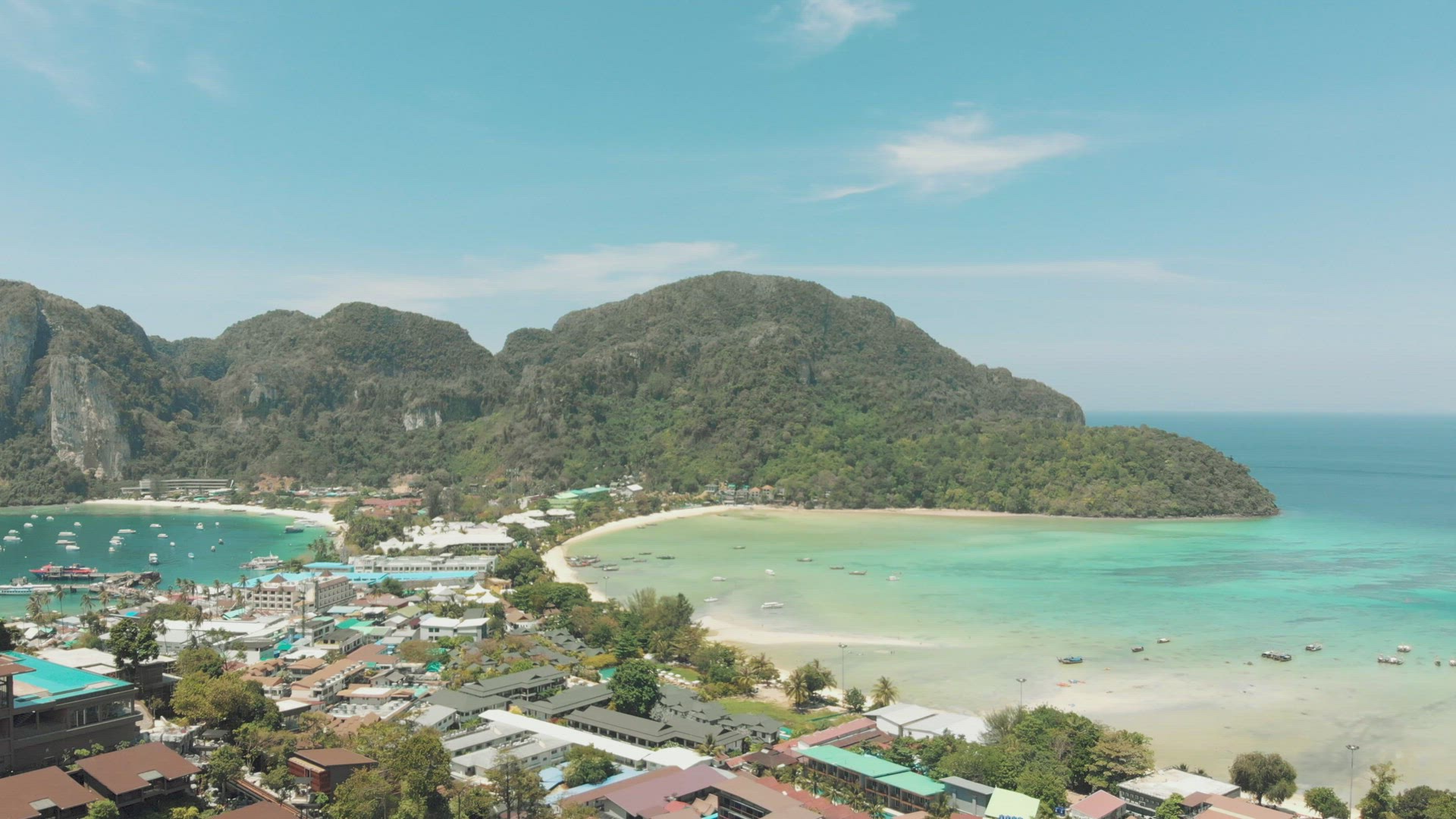 Aerial view limestone cliffs caves collapsed cave systems and archaeological sites are found in Phang Nga Bay, Thailand, RED EPIC