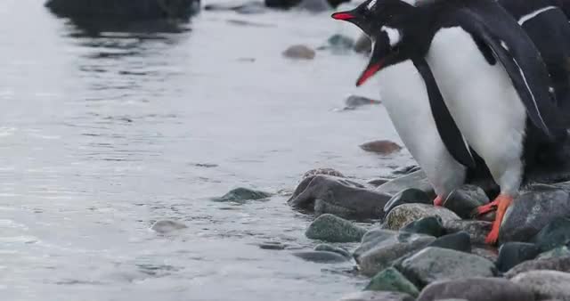 MS Group of Gentoo Penguin (Pygoscelis papua) chicks on rocks by water / Cuverville Island, Antarctica