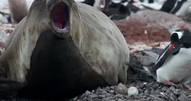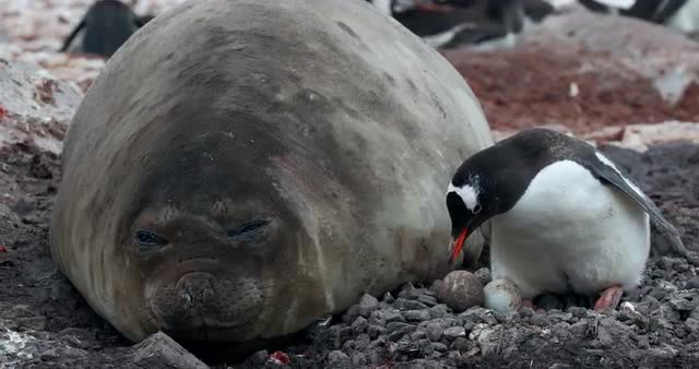 SLO MO CU Southern elephant seals (Mirounga leonina) lying on rocks at Torgersen Island / Antarctic Peninsula, Antarctica