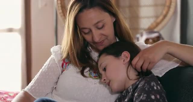 MS Mother and daughter (10-11) embracing on sofa in living room / Florence, Tuscany, Italy