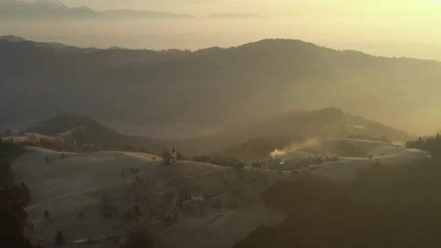 1091541 - Foggy aerial view flying over rolling hills in Slovenia