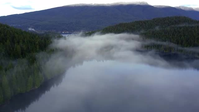 1361717 - Opening shot of the hills covered with pines. Fly through the fog
