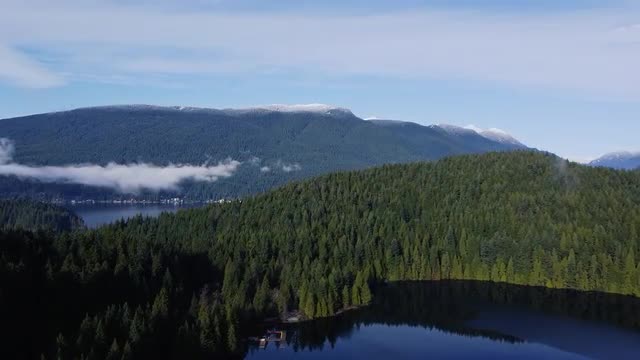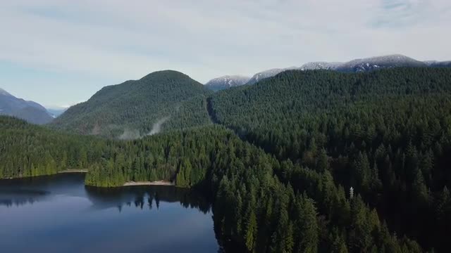 1361754 - Fly towards the mountains over hills covered with green forest and small lake