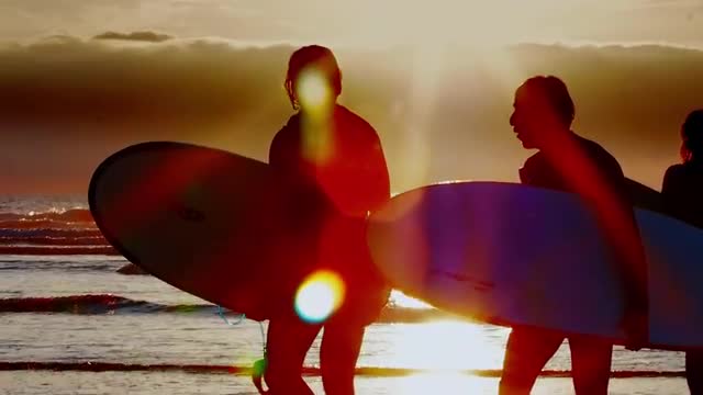 Group of young male and female surfers come from the sea with their boards after a surf session on a spectacular sunset of enjoying the amazing and colourful views.