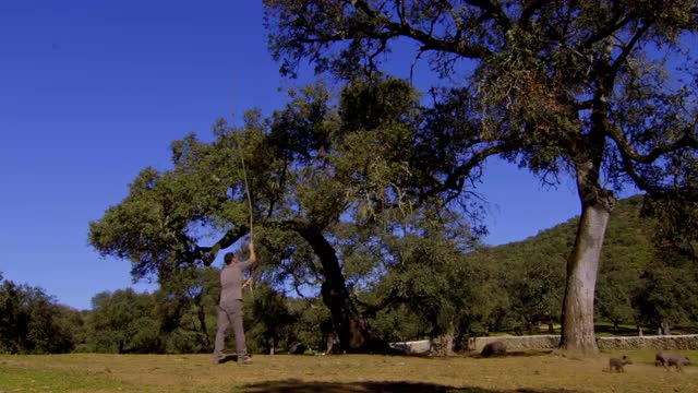 Extra detailed image of a ham cutter with his knife cutting a thin slice of Iberico jamon