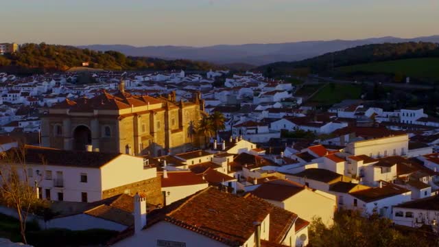 panoramic image of the town of Jabugo where the camera is turned from the right to the left and shows us the beautiful little white town with orange roofs and the nature around it