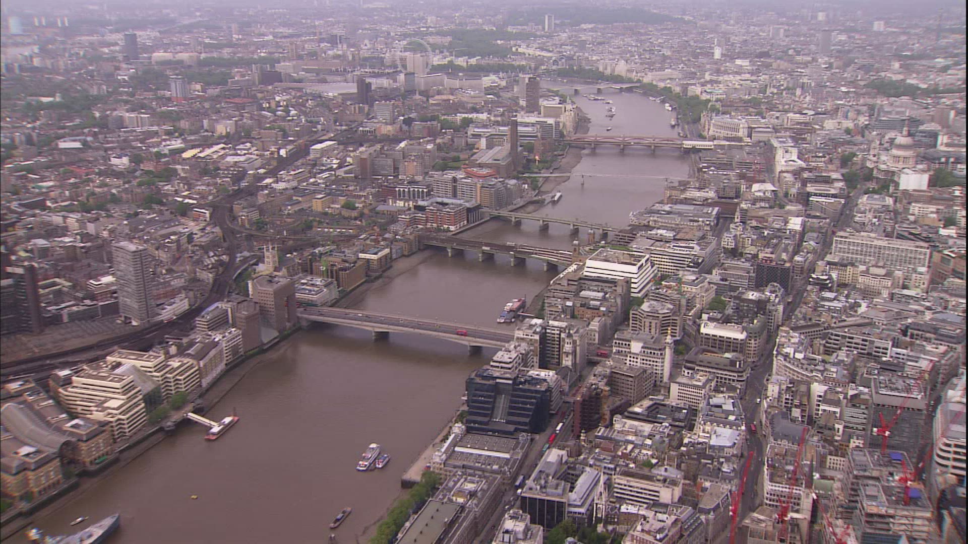 > stately London buildings on an empty street where a typical London red double-decker bus passes