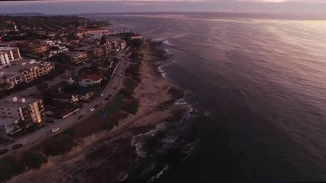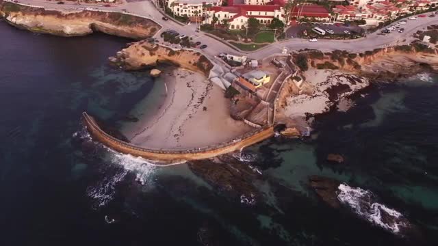 Bird's eye zenital aerial drone shoot in asturias on a wooden skateboard bowl and skaters riding during a beautiful autumn morning with pristine colors with wonderful beach apartments around and green fields