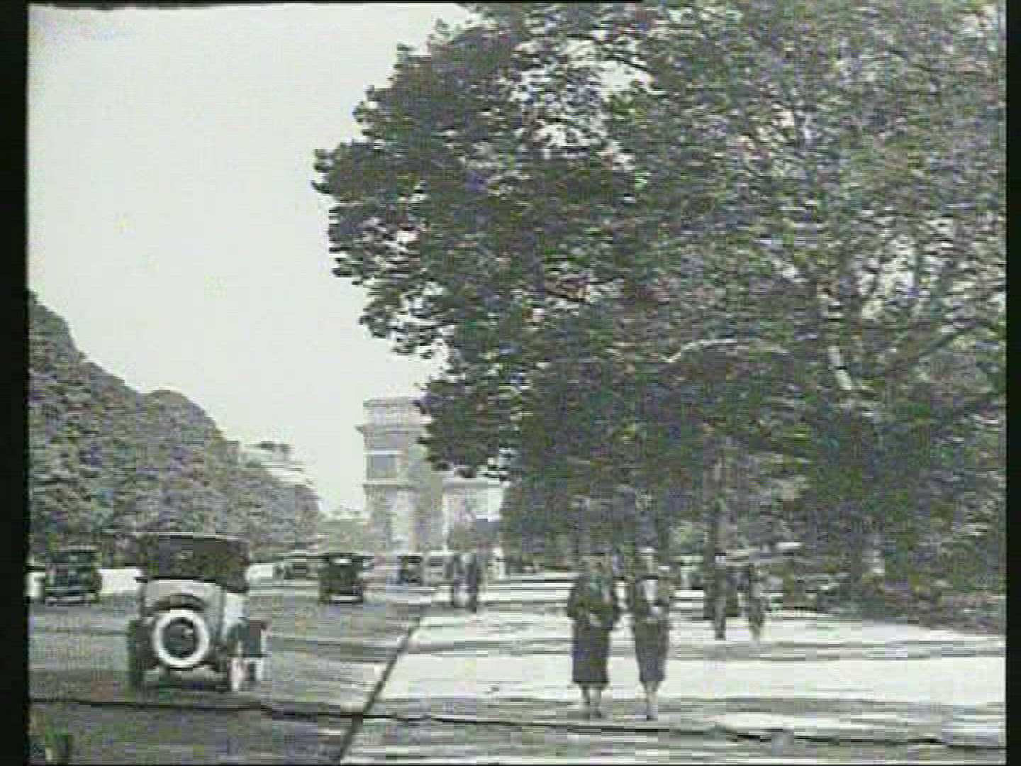 > Close up Avenue des Champs-Elysées where you can see the traffic moving and the Arc de Triomphe