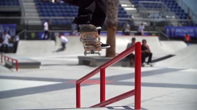 > skateboarders makes an impresive trick on a red rail while a skate session contest