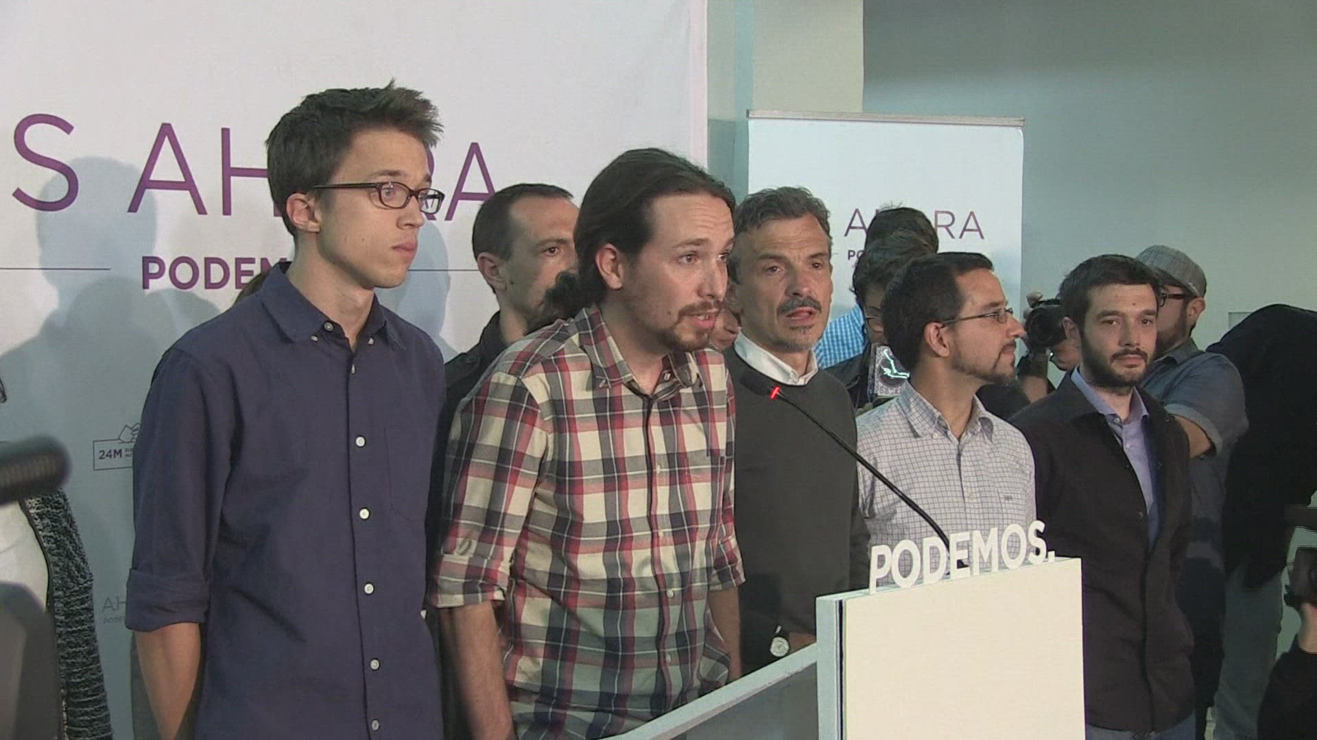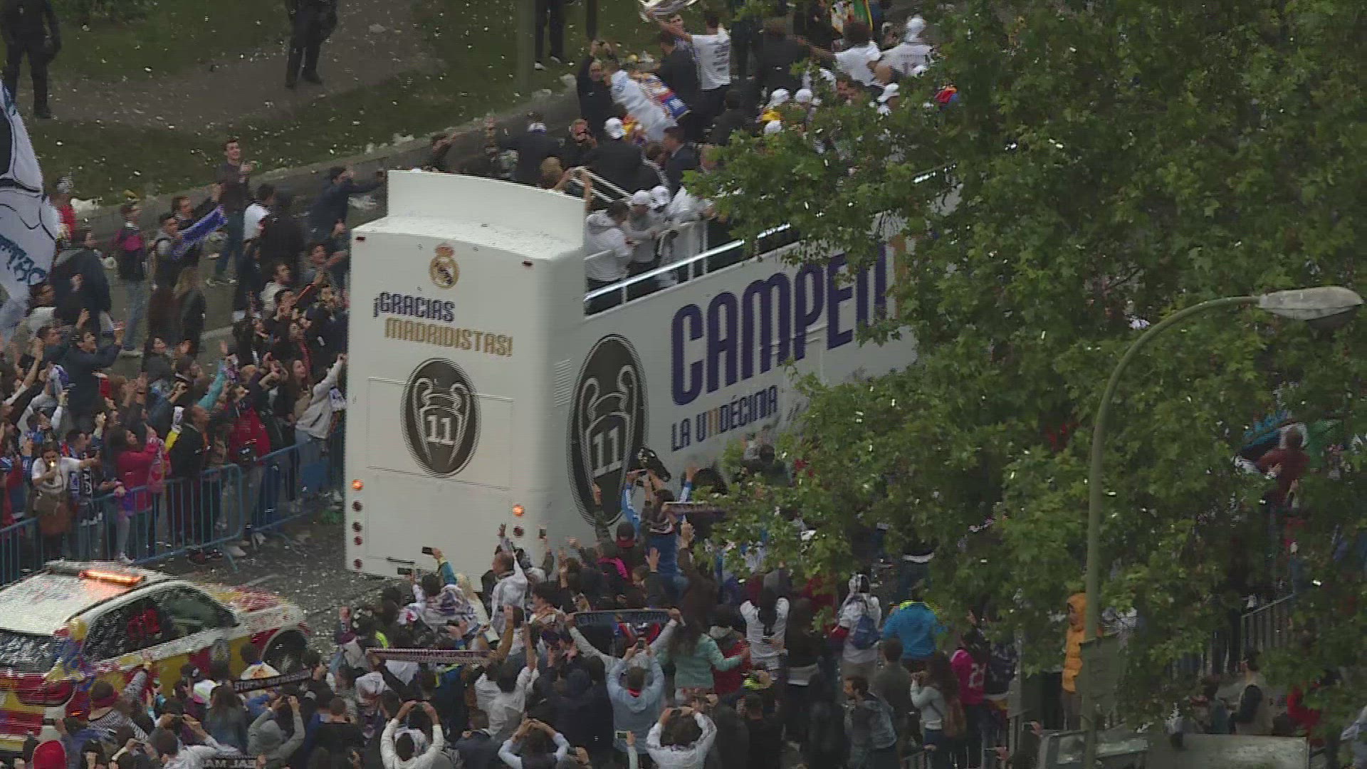 > Skateboarders ride by the magnificent Royal Palace and its surroundings in Madrid at night with bui