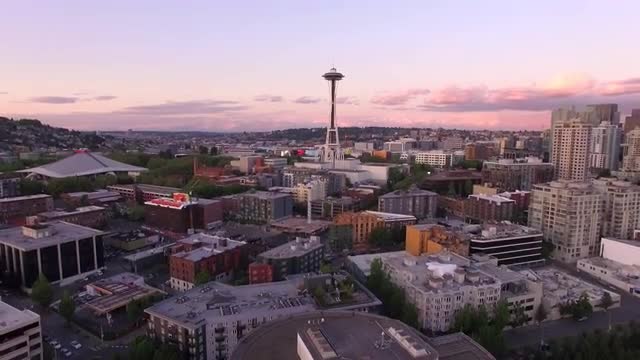 560140 - Seattle, WA 4-29-16: Aerial Fly Over Downtown City Buildings to Space Needle