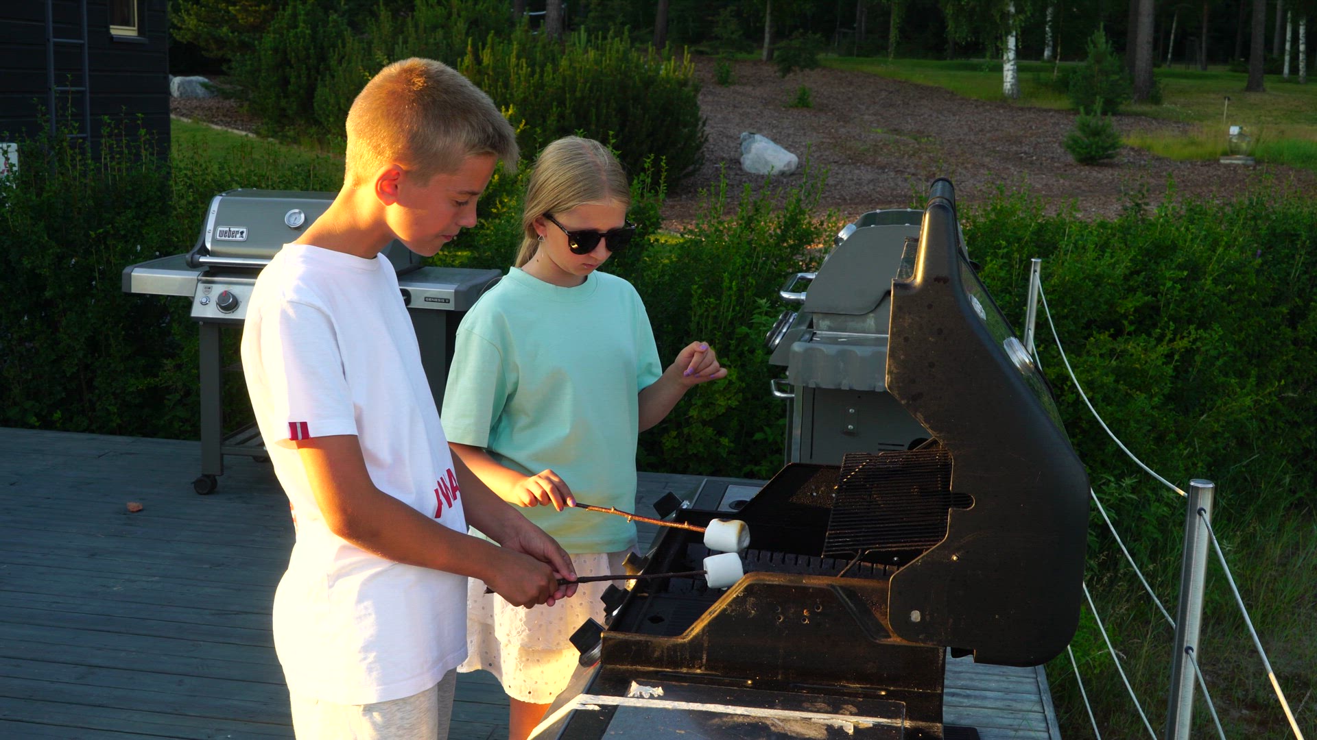 two young boys walking barefoot on planks over river with streaming water - rapids