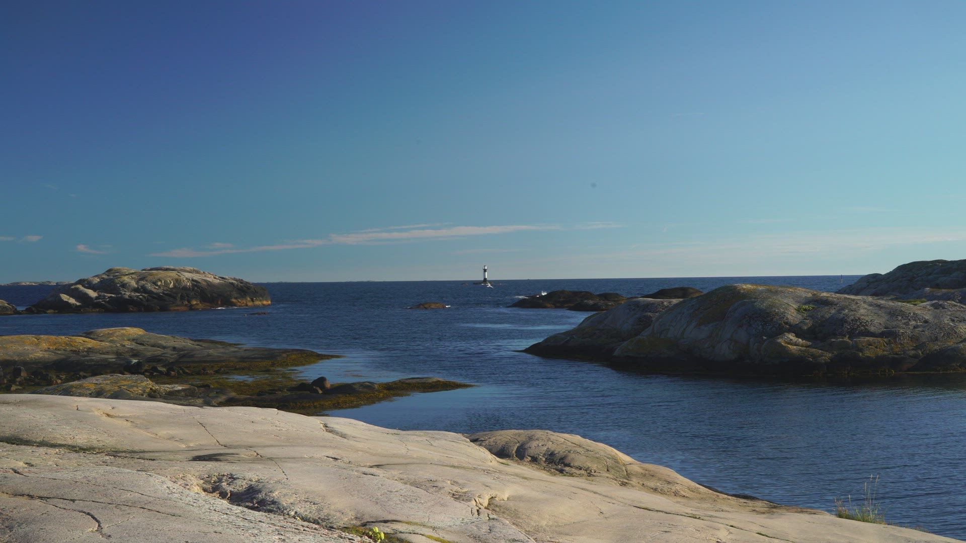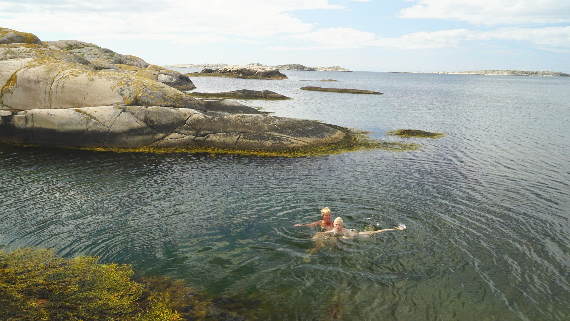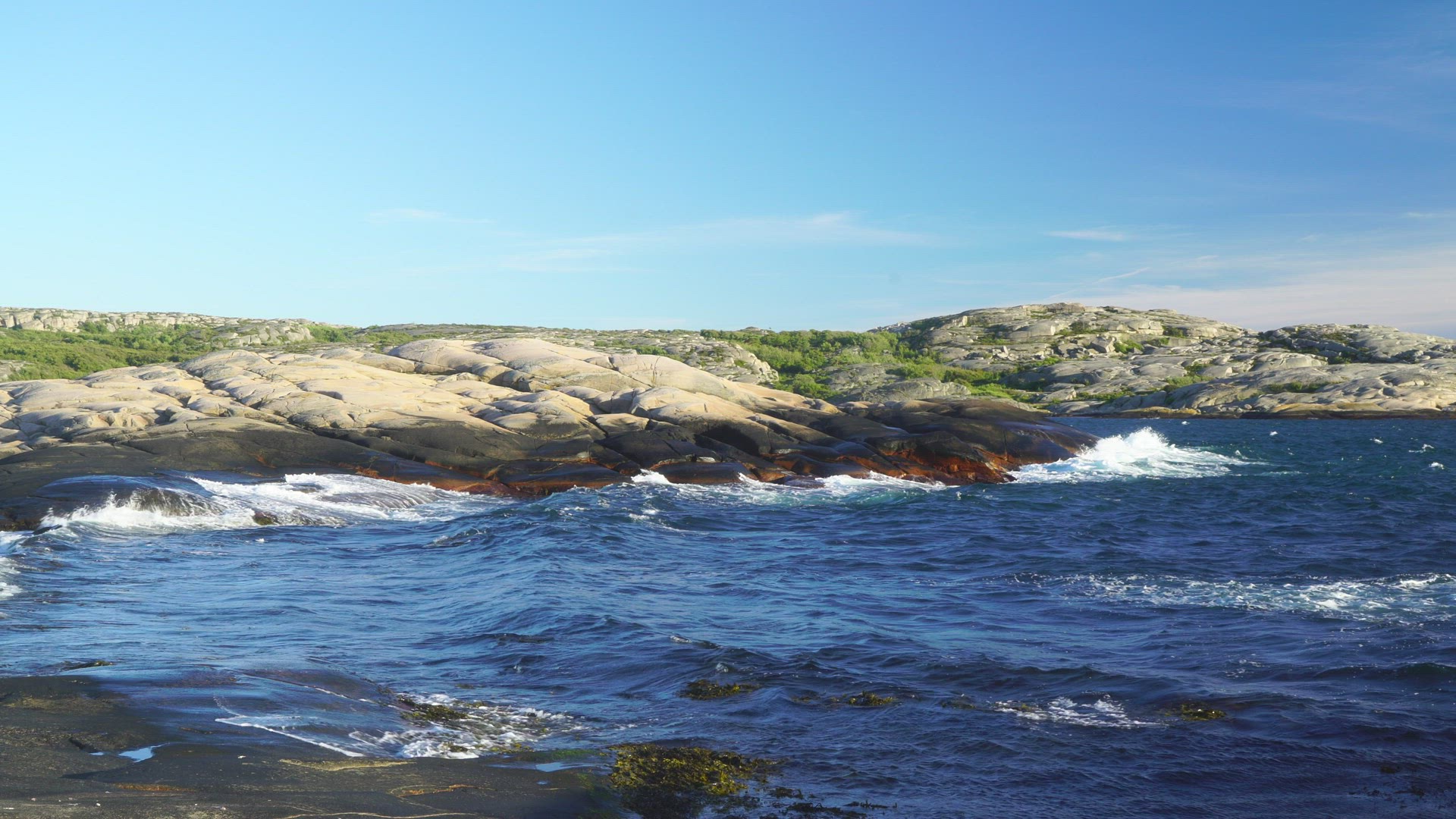 boy climbing and hanging on old broken down jetty - in Bohuslän on swedish west coast