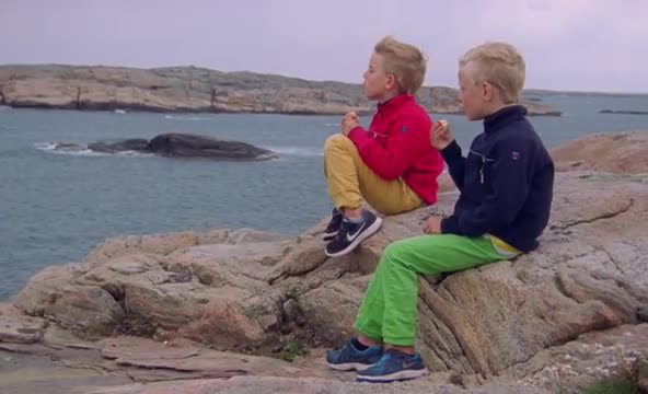 two boys sitting in boat watching out over sea and other boats in Bohuslän, Sweden
