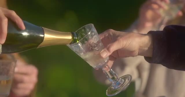SLO MO CU Champagne being poured into vintage glass outdoors / Dorset, UK