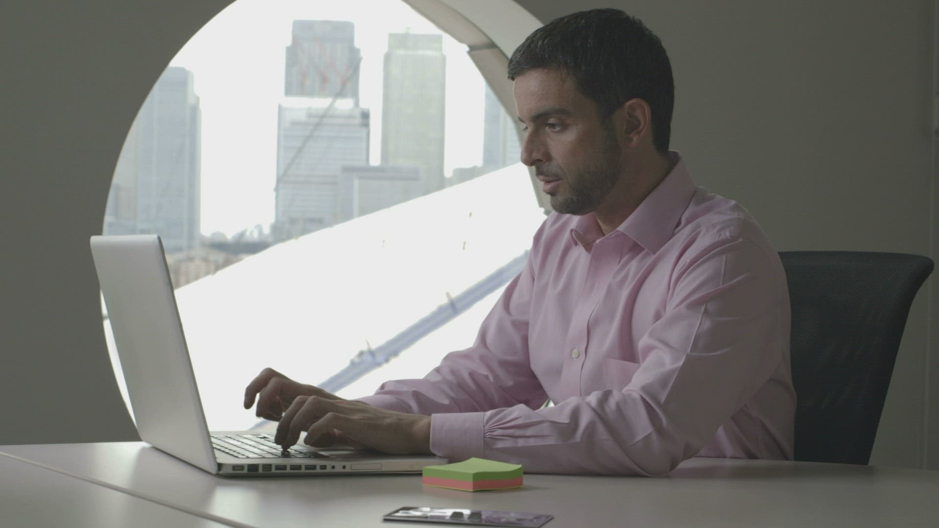 199811 - Ethnic Male Financial Advisor Travel Hotel Room Smart Phone Communication