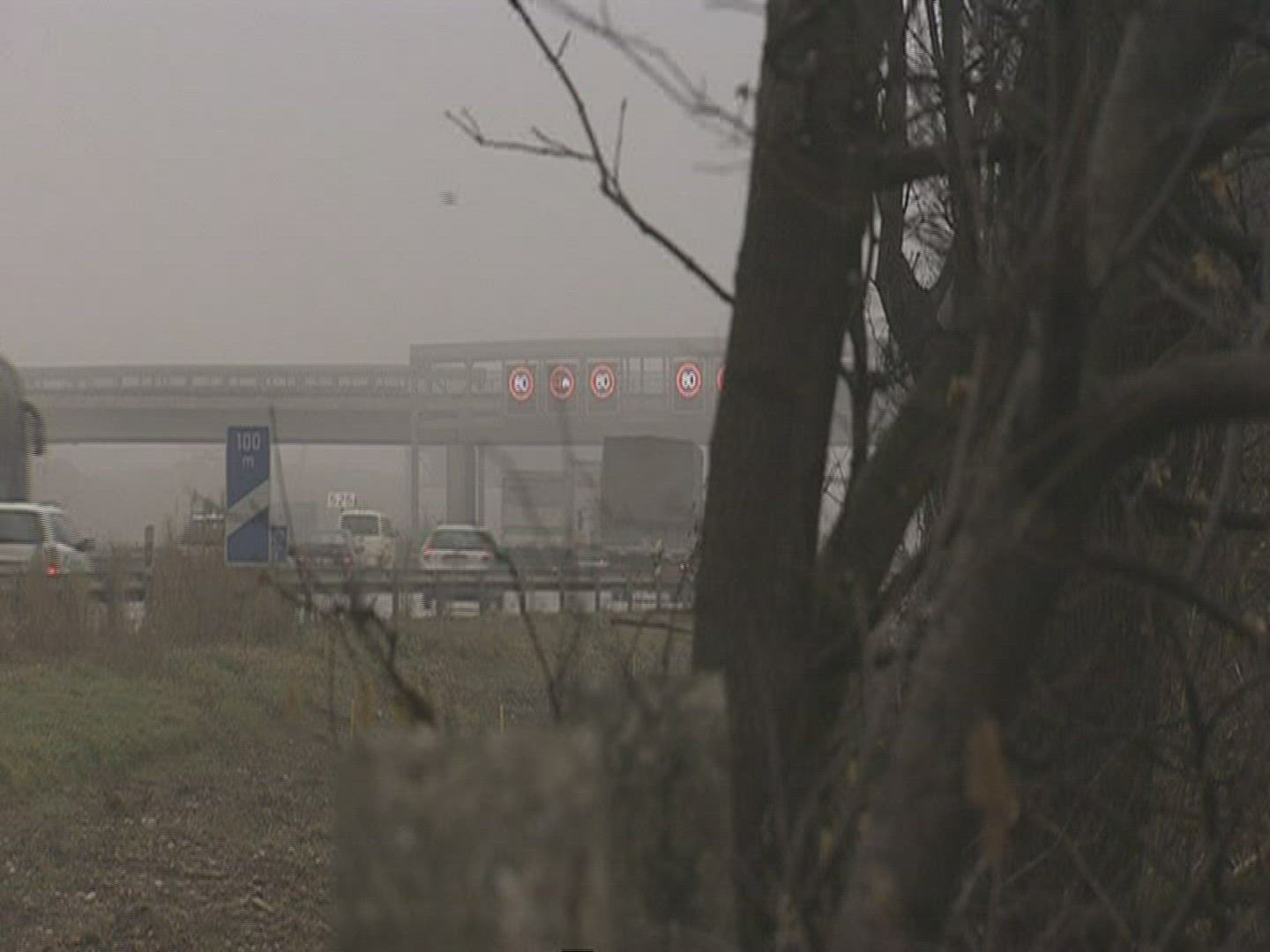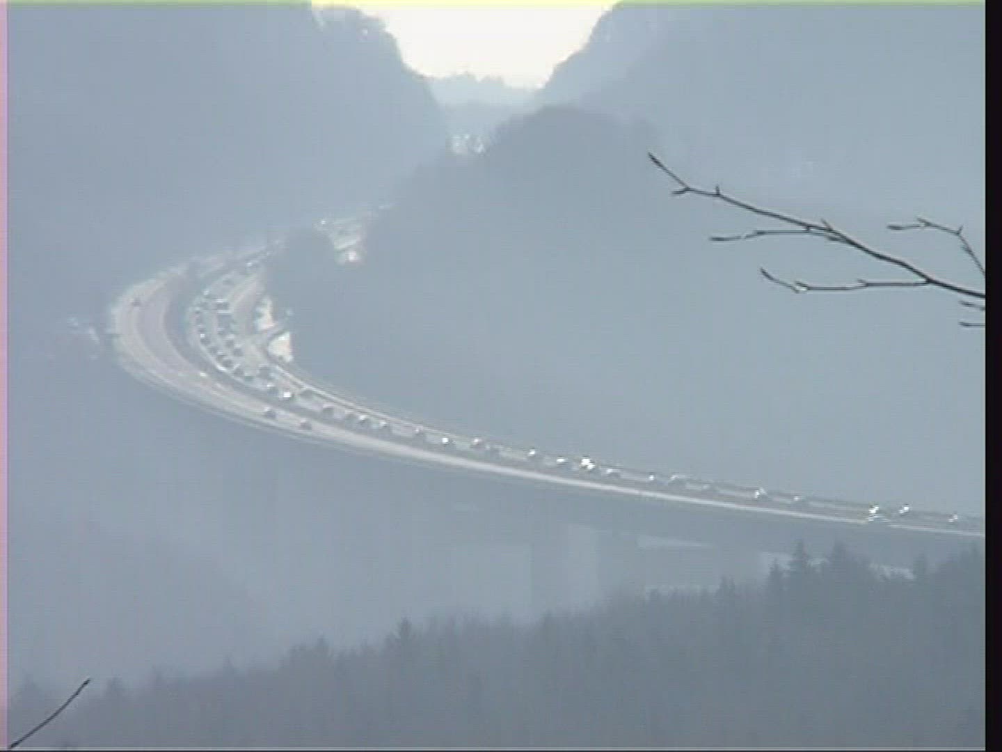 This is an aerial shot that skims the surface of a lake and pans up to a bridge that is engulfed in fog.