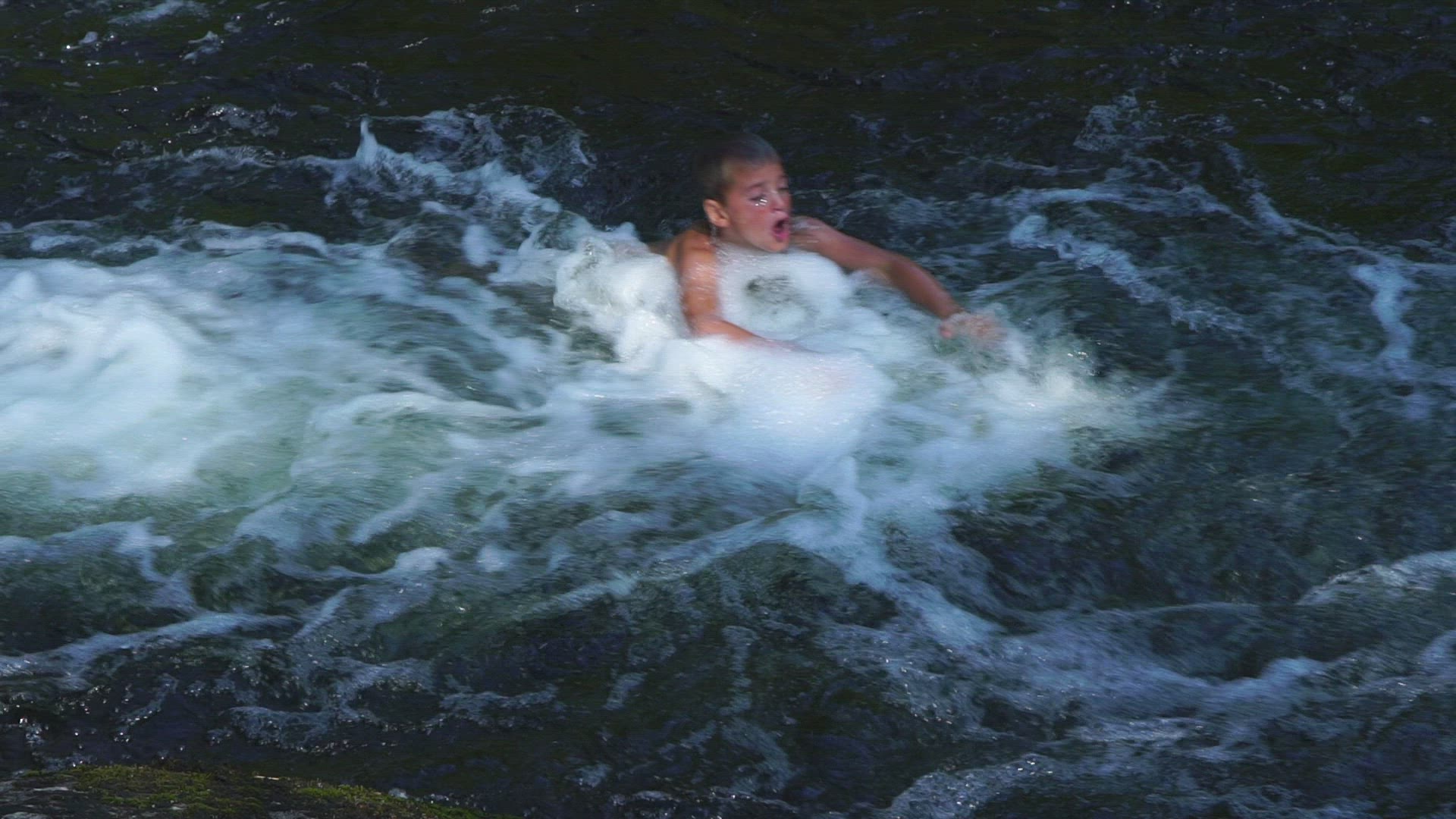 slowmotion shot of boy jumping into river with streaming water