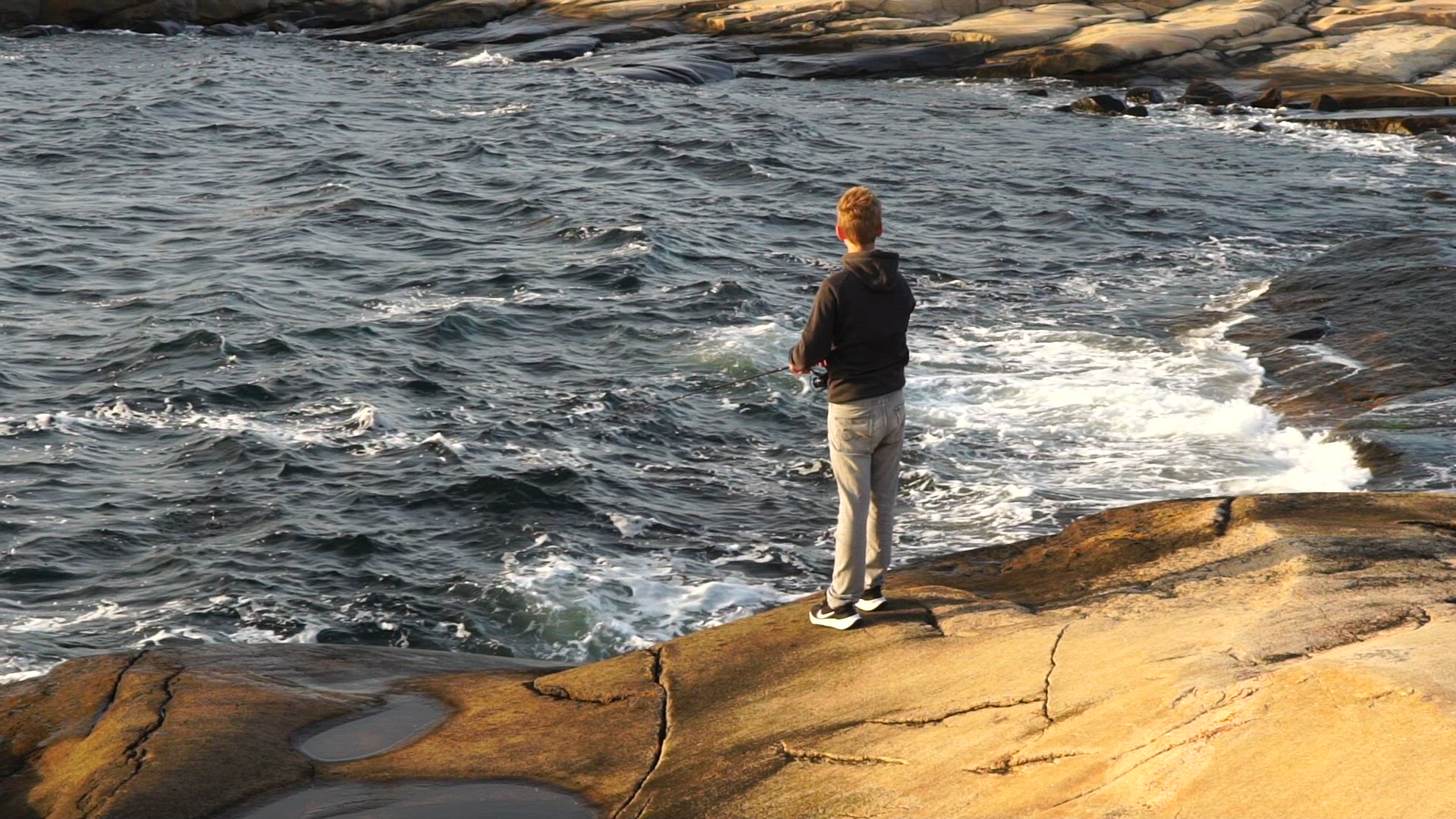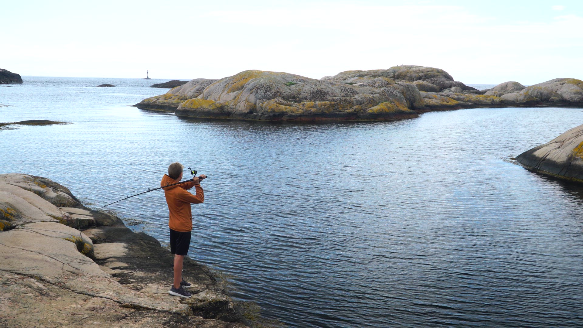 young boy diving into sea from diving board on swedish west coast, Bohuslän