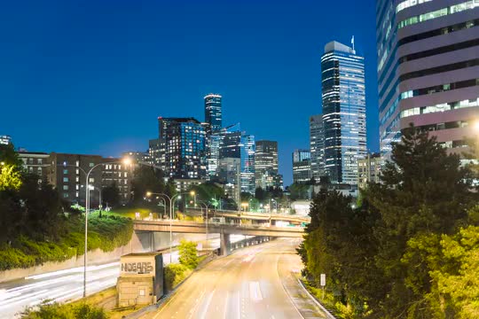 Night Timelapse of Seattle Skyline Over Highway Infrastructure at Denny Way Bridge with Cars passing, and city skyline illuminating.