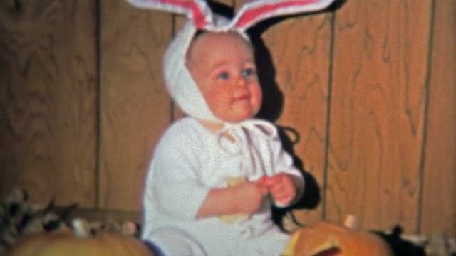 320872 - DALLAS, TX - 1971: Baby dressed up as bunny for Halloween with Jackolantern pumpkins carved.