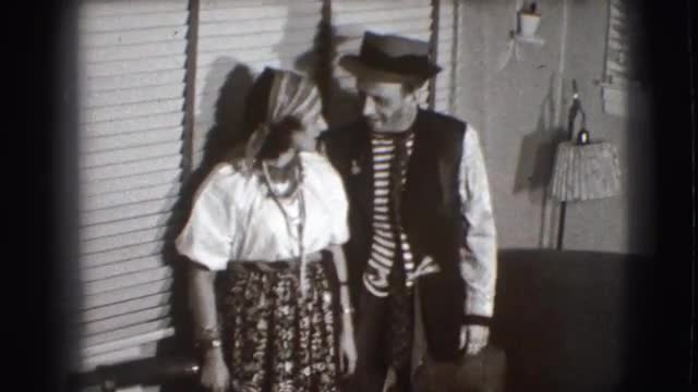 627103 - 1941: silly-dressed couple poses by window NEW YORK