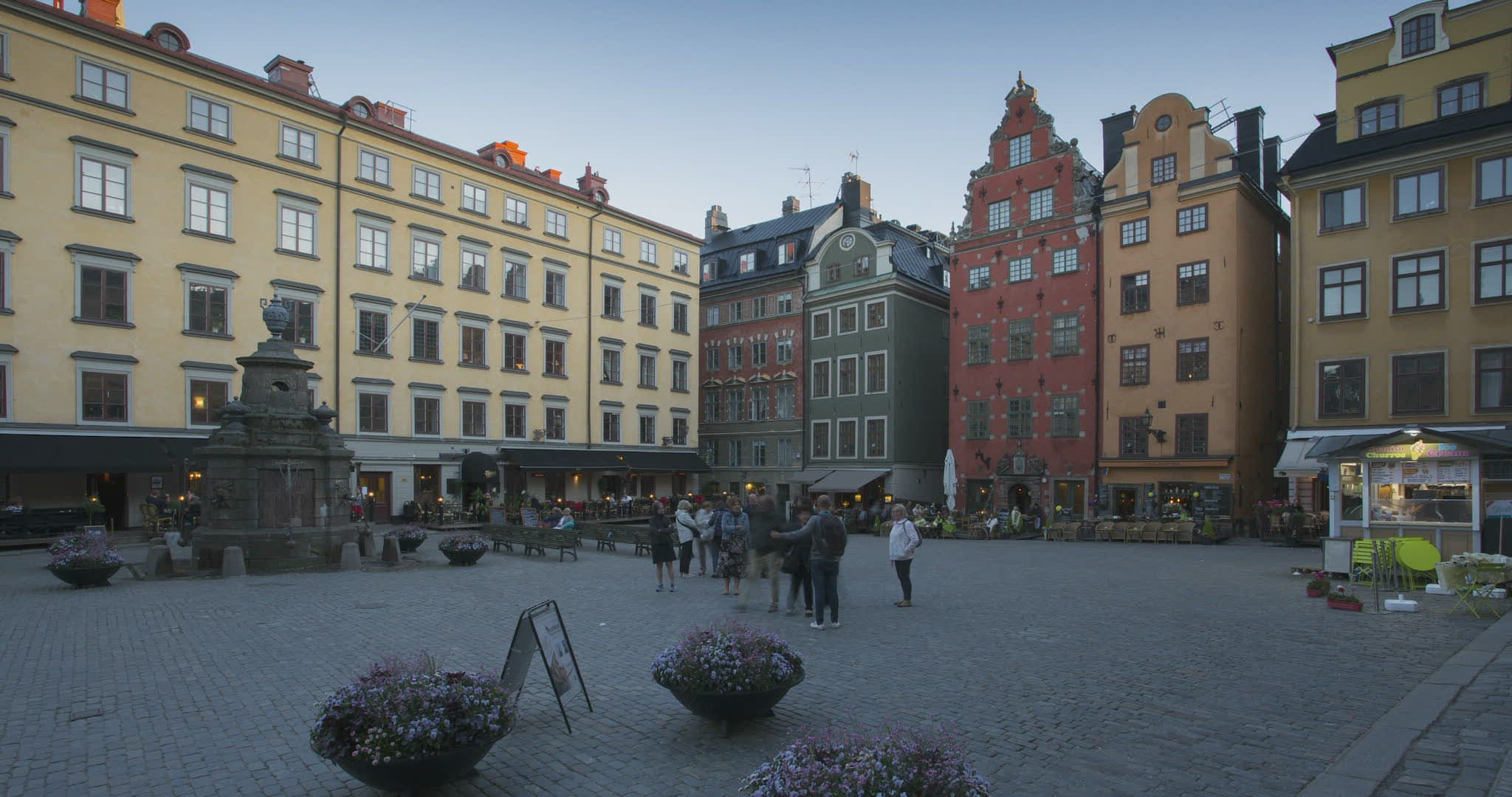 people walking across Sergels Torg in central Stockholm - beautiful colourful decorations in the air
