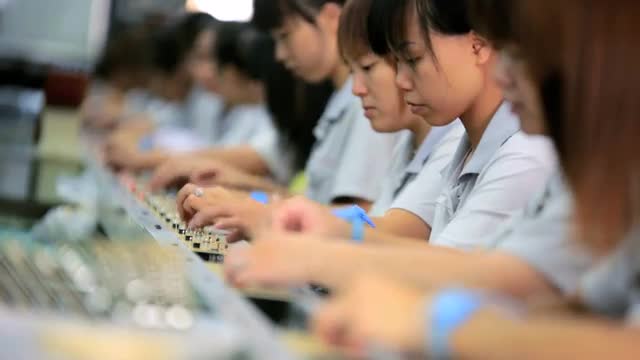 China - October 2013: Chinese factory workers manufacturing electronic Printed Circuit Boards for export, Mainland China, East Asia