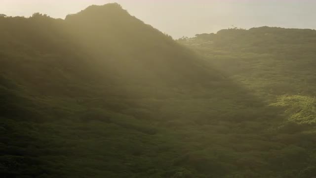 Aerial/ Pan left shot of light rays shinning on mountains in Oahu