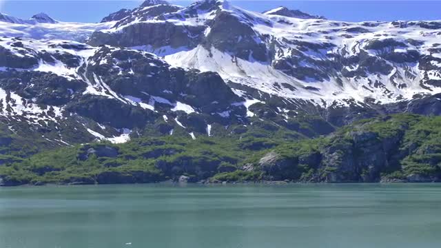 55356 - A jagged, snowy mountain range against calm water.