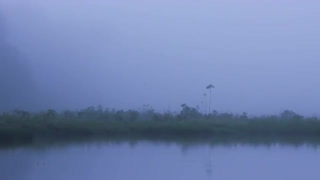 695111 - Pan of foggy rainforest lake and grassy shoreline