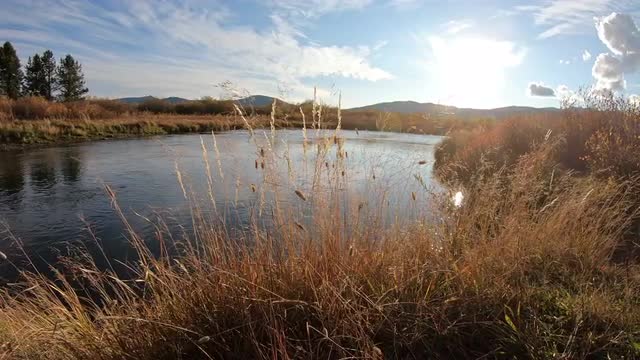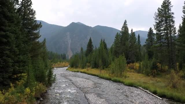 Flying down stream over the Madison River through the trees on the banks of the water in Montana.