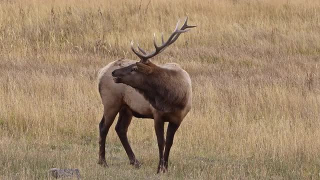 Bull Elk standing in grassy field looking around as it grazes in Yellowstone.