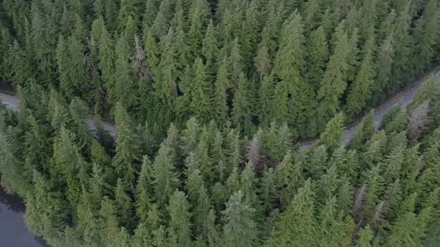 > Flying over pine tree forest viewing road cutting through the thick trees