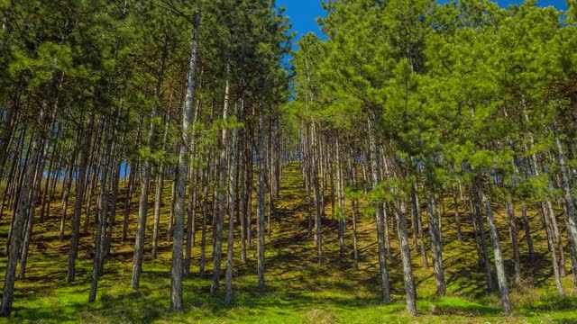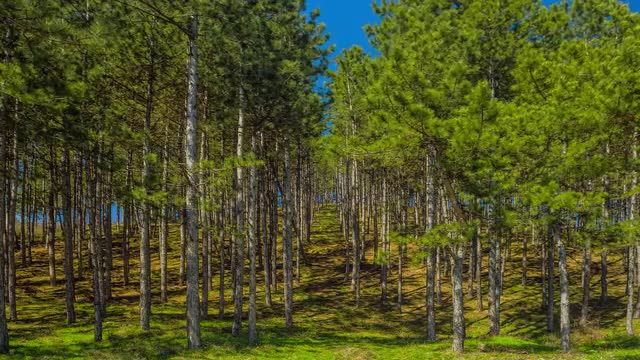 Aerial view over pine tree forest near West Yellowstone Montana on sunny day.