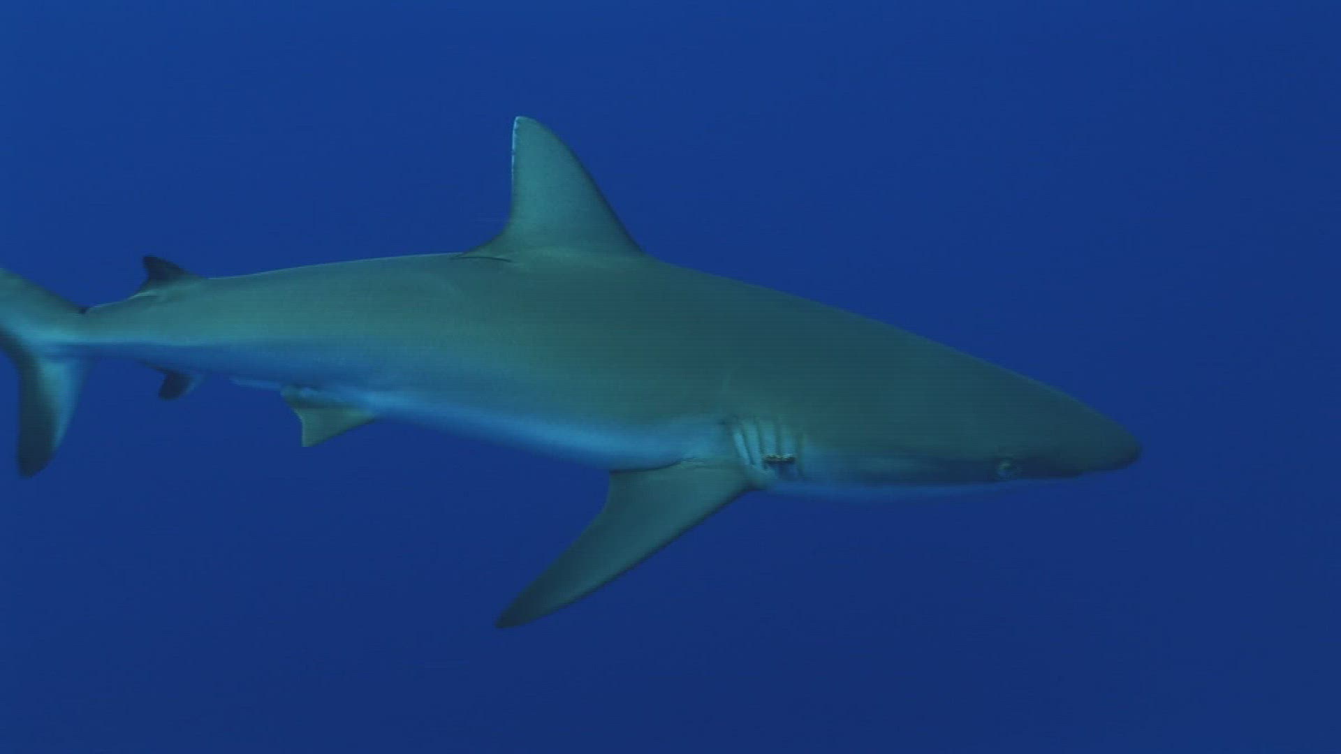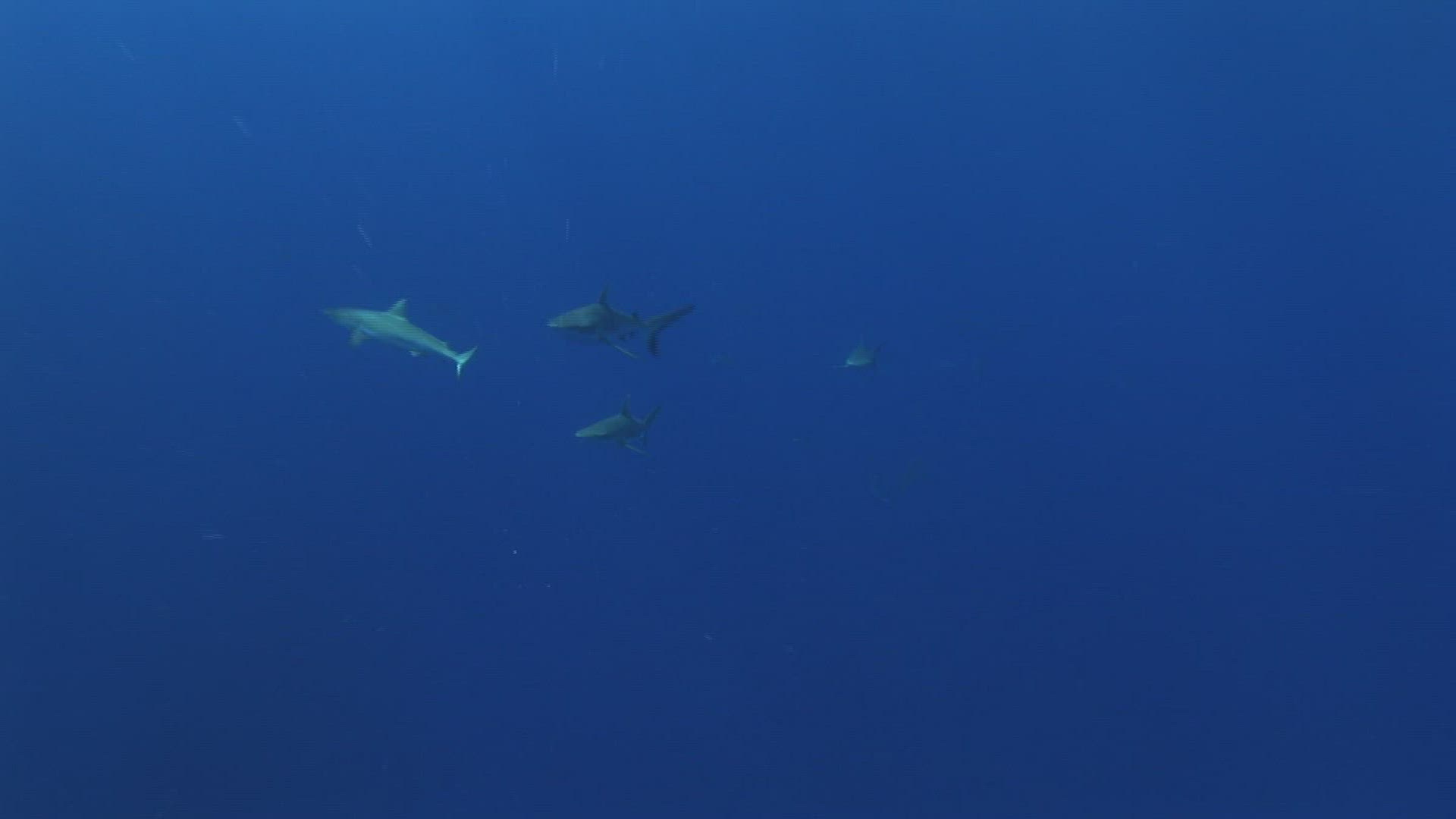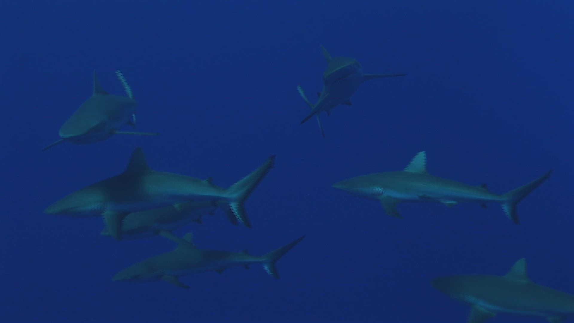 Large Group of Grey reef sharks in the atoll of Fakarava in the Tuamotu Archipelago, French Polynesia. Beautiful shots in backlight and close up shots